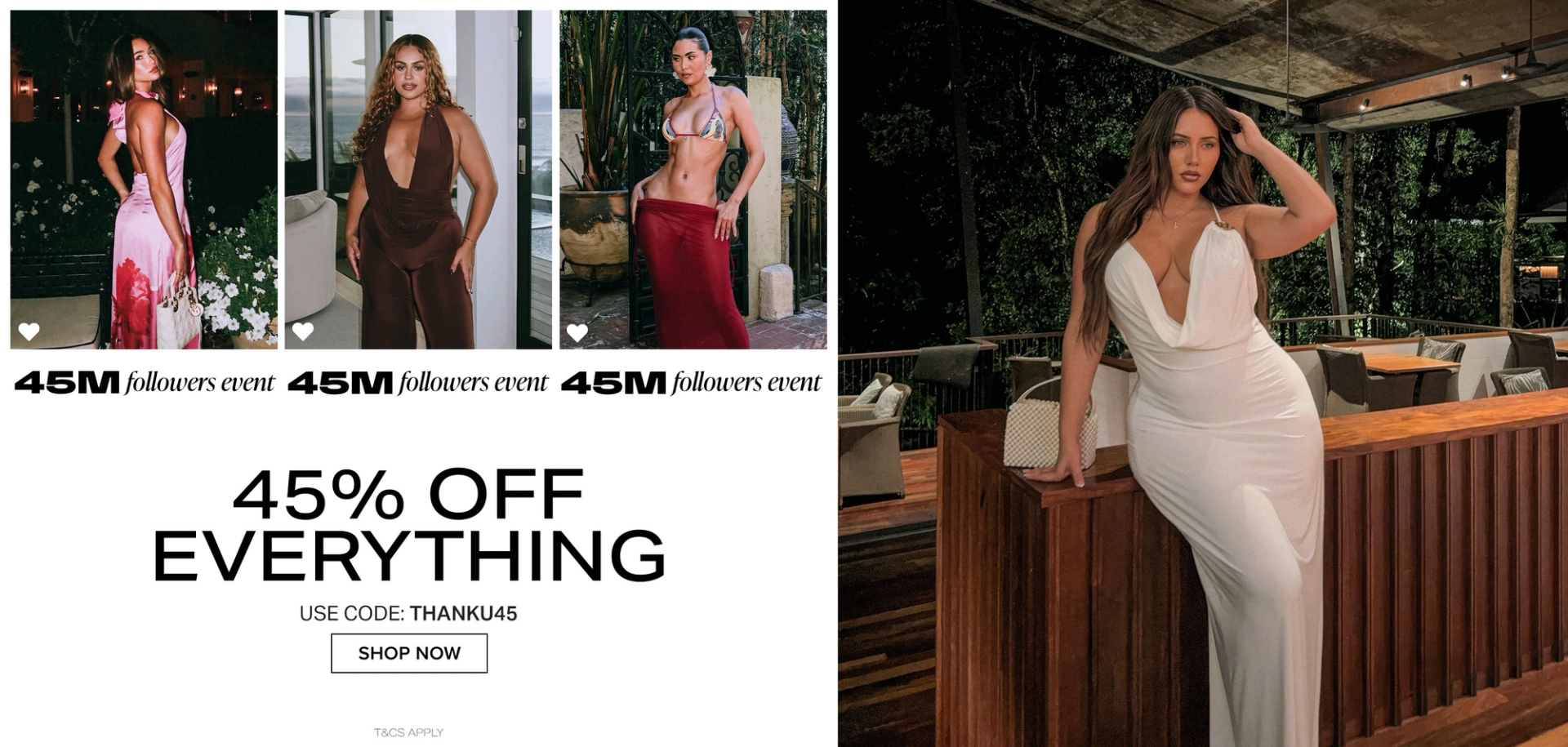 Beautiful plus-size model in a yellow one-shoulder top and skirt, silver hoops, promoting NOVACURVE's latest curve fashion.