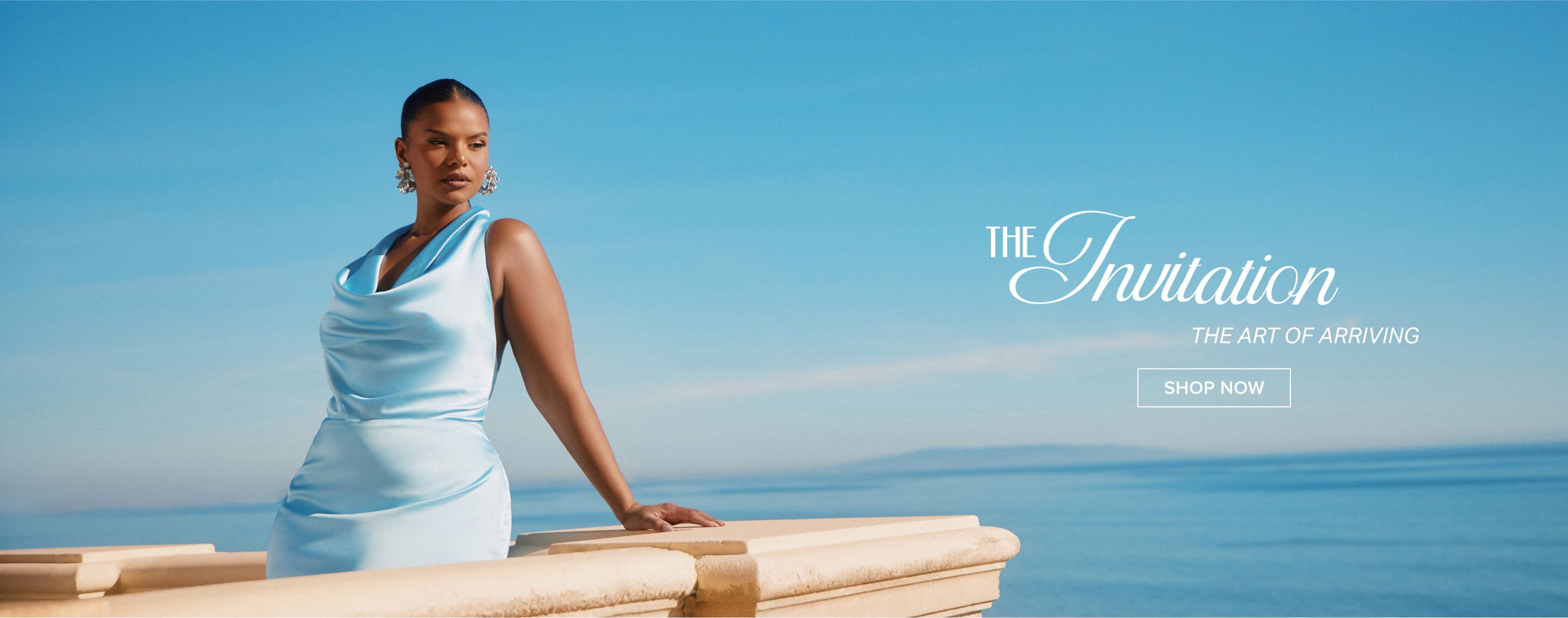 Elegant woman in a light blue satin cowl neck dress and floral earrings, showcasing new occasion wear collection. Shop now.