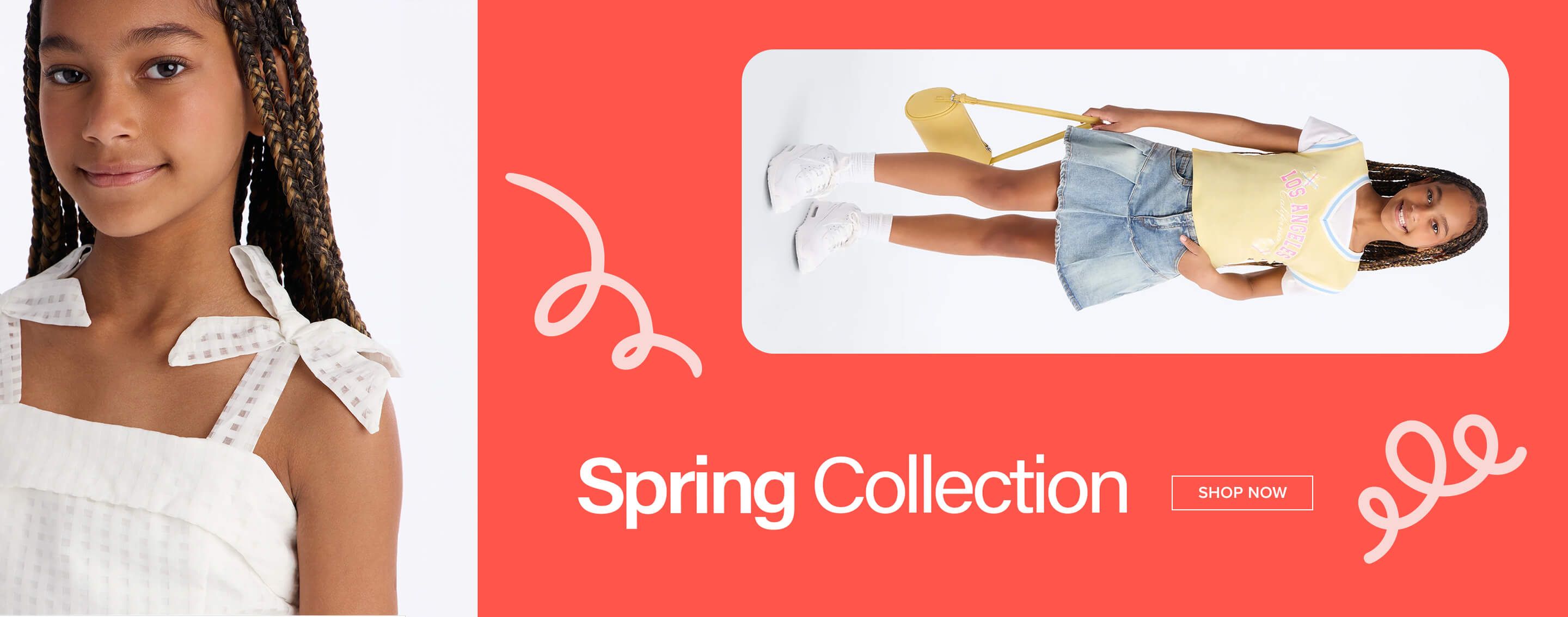 Smiling girl in white top; another in yellow Los Angeles tee, denim skirt, and white sneakers, holding yellow bag. Shop new girls' spring collection.