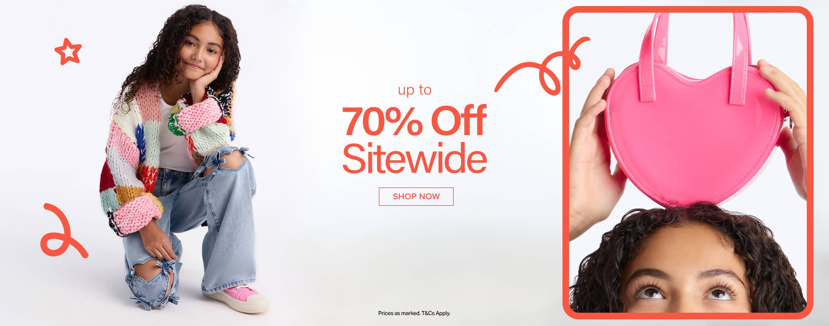 Vibrant pink heart-shaped bag held above a person's head, advertising "up to 70% Off Sitewide" with a "SHOP NOW" button. Explore discounts!