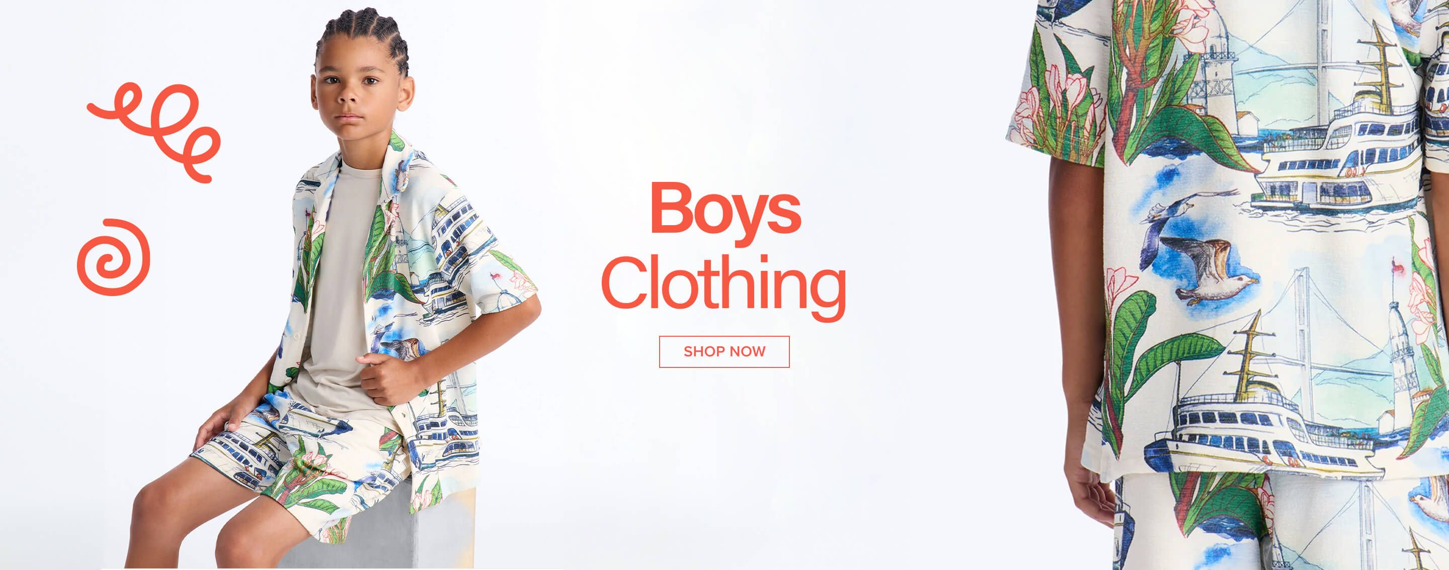 Boy modeling a trendy boys' summer outfit: an open short-sleeve shirt and matching shorts with a vibrant nautical print. Shop new kids' clothing.