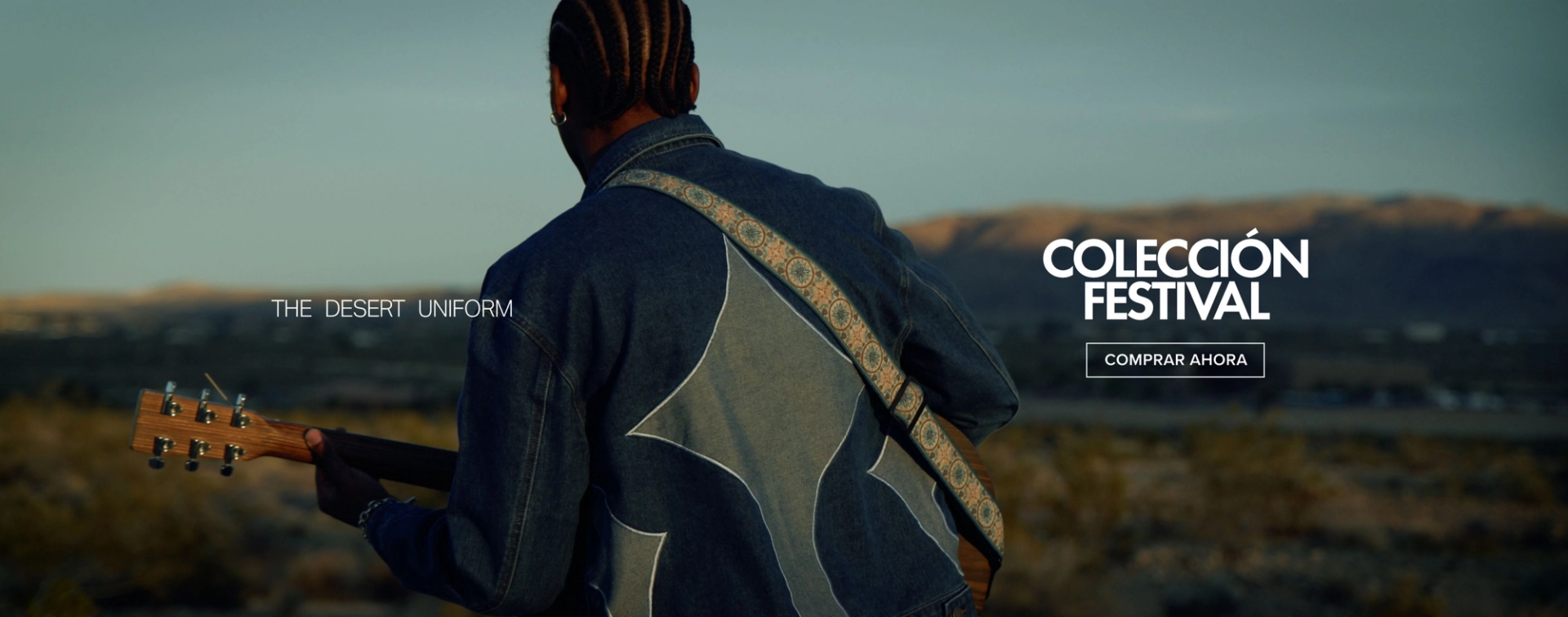 Banner de paisaje montañoso desértico anunciando rebajas con 60-80% de descuento y botón "Comprar Ahora".