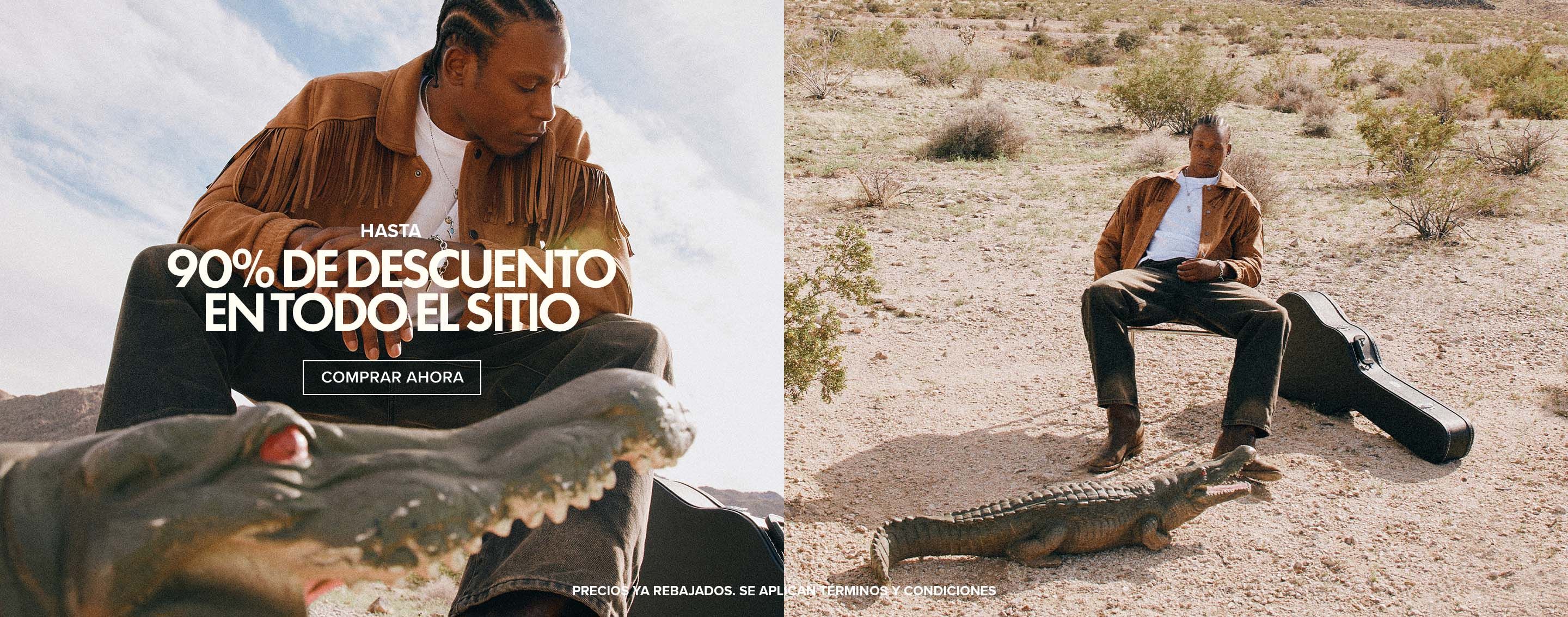 Hombre con chaqueta de flecos y pantalones oscuros, sentado junto a caimán. ¡Hasta 90% de descuento en moda!