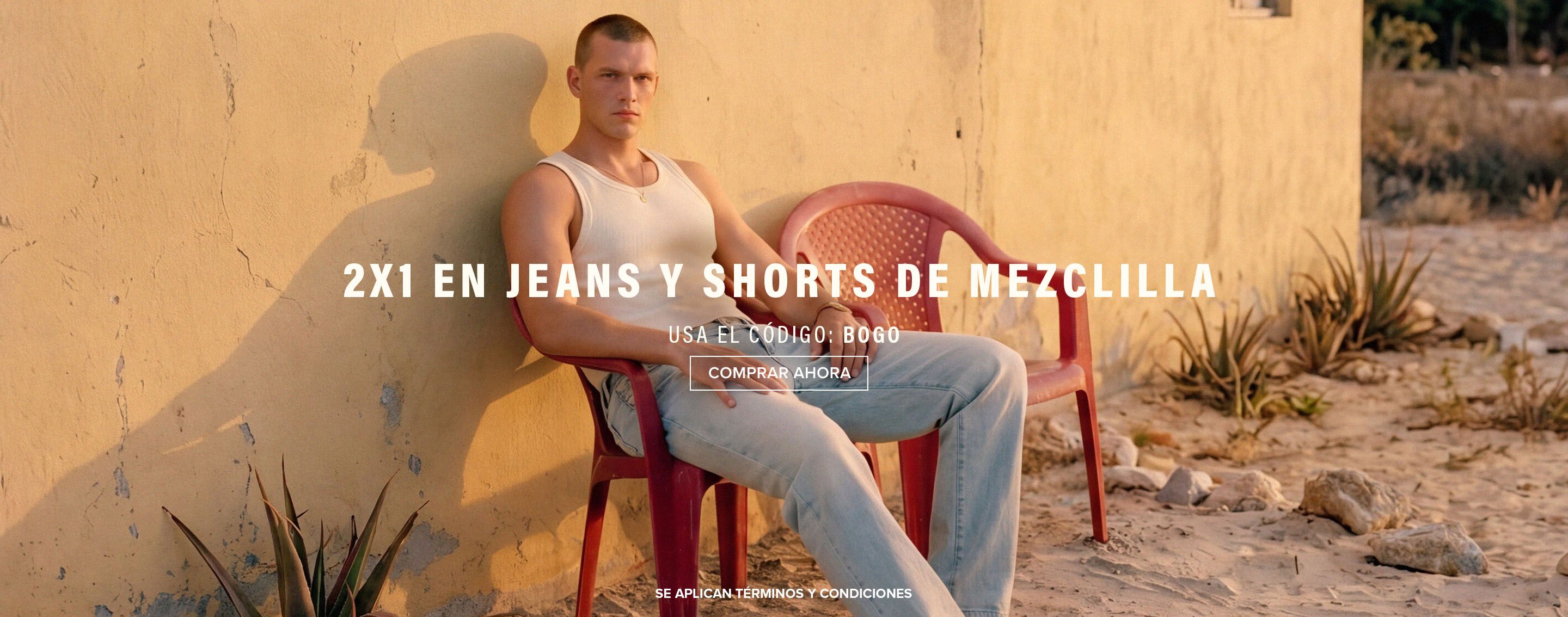 Hombre con camiseta blanca sin mangas y jeans claros, sentado en silla roja junto a pared amarilla. Promociona 2x1 en jeans y shorts de mezclilla.