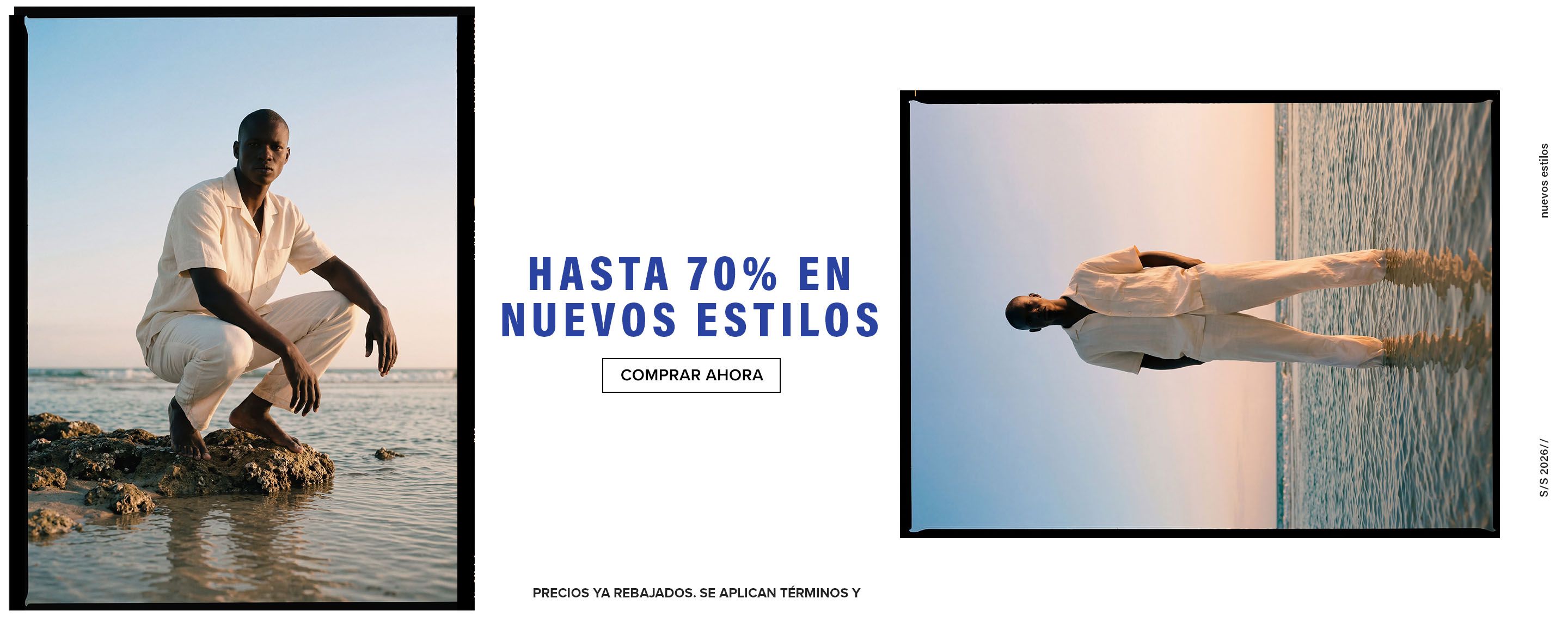 Hombre en atuendo de lino crema, en cuclillas sobre rocas junto al mar. Promueve la venta de nuevos estilos de verano para hombre, hasta 70% de descuento.